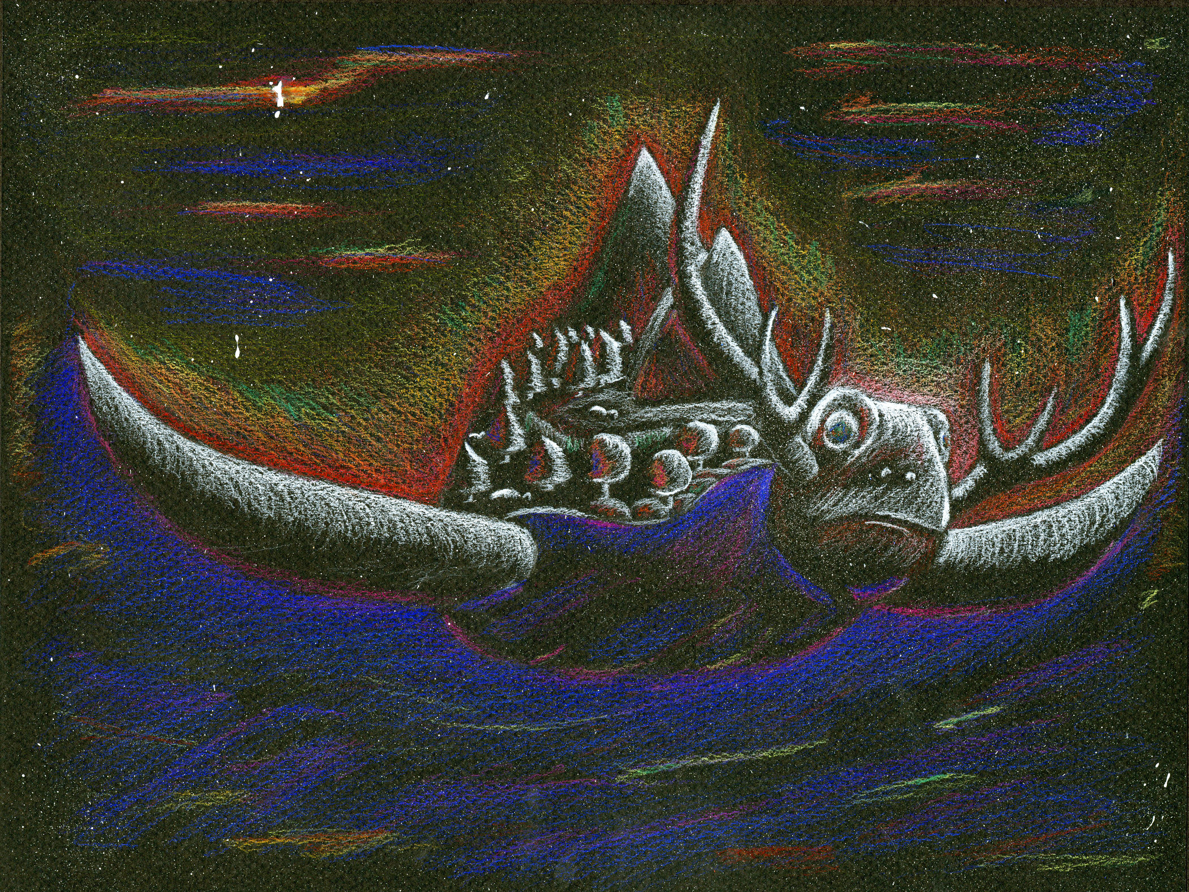 It's a merge of a turtle and deer flying through space with the world on his back.