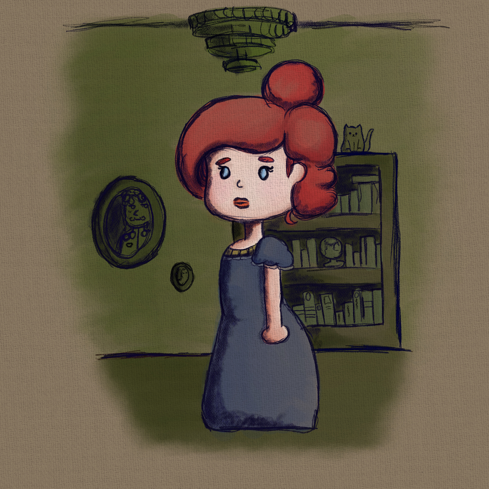 A duchess taking a walk in her eerie palace, dressed in a blue dress.